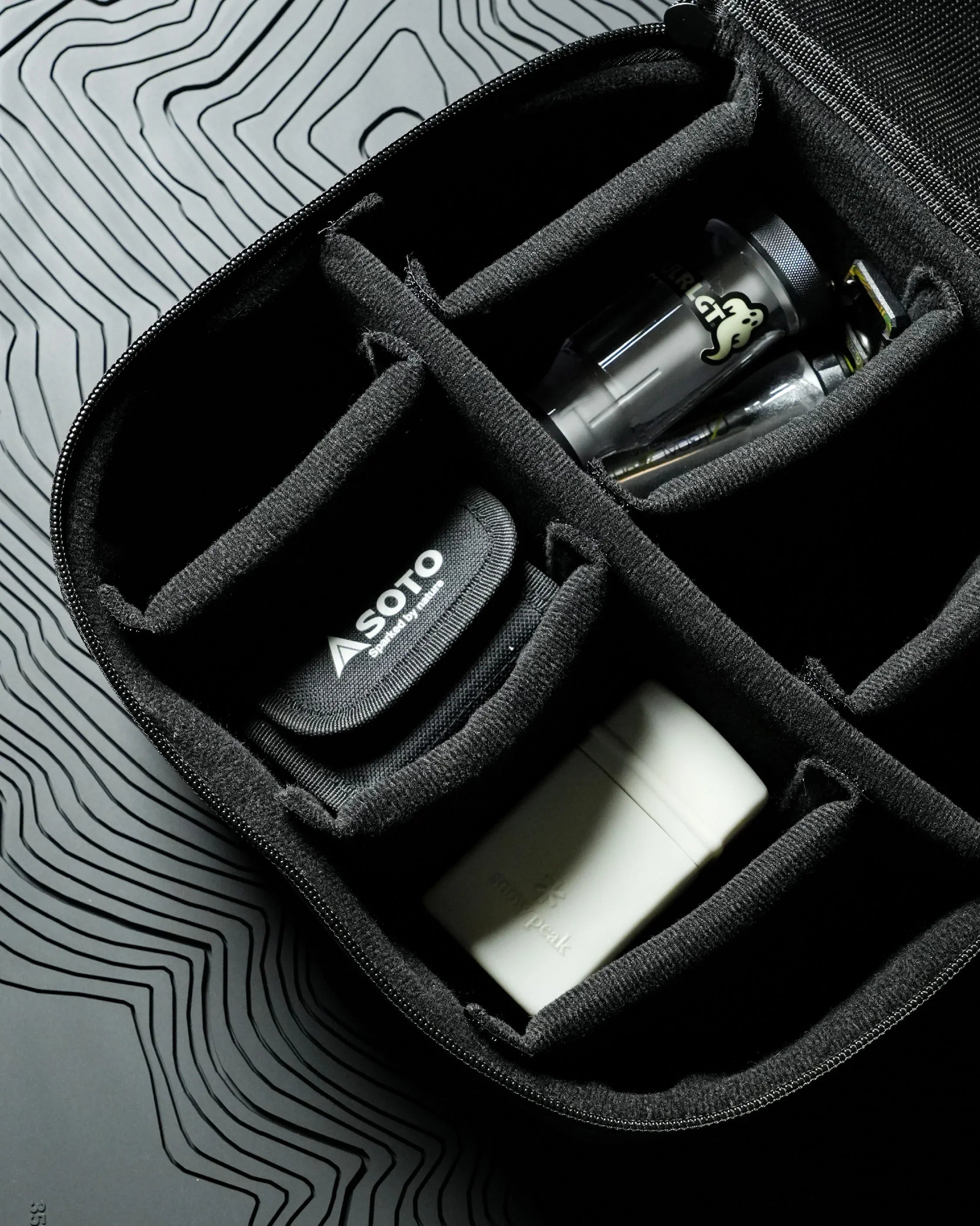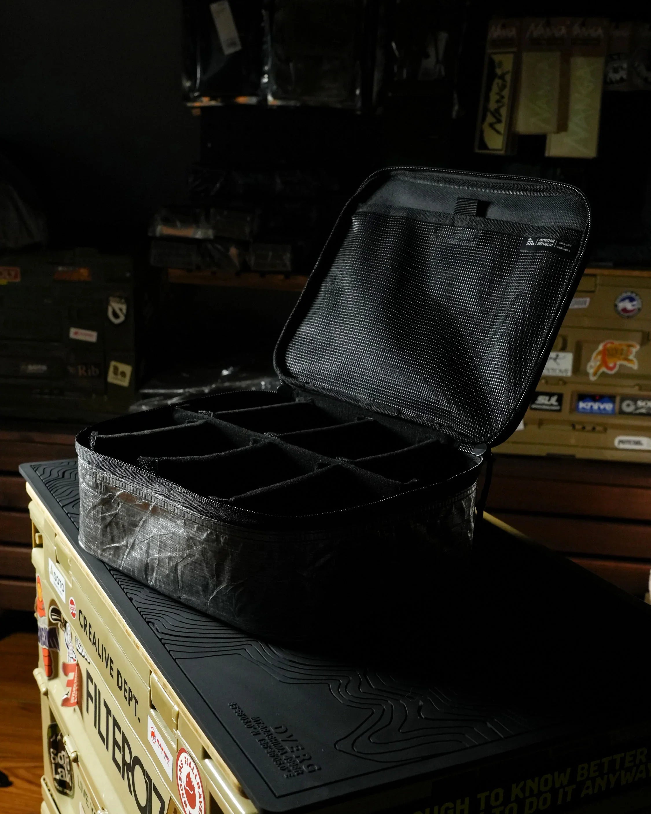 採用 Dyneema® 面料製成的裝備包,可存放露營使用的工具或是居家存放物品。Dyneema® 物料具備了耐磨的特點,所以確實也是非常耐用。裝備袋裡帶有最多可分為8個間隔的隔層板,可根據要存放的裝備進行佈置。雖然 Dyneema® 面料是高強度耐磨特點,但是尖銳物體也容易損壞表面。
